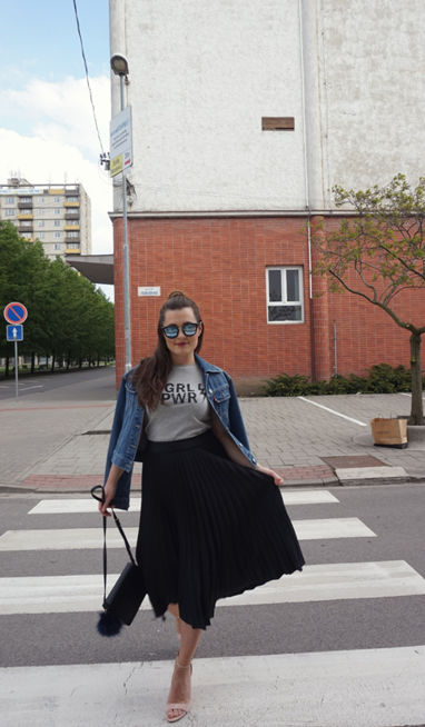 Ja som sa rozhodla zladiť moju čiernu plisovú sukňu v streetstyle štýle, ktorý ale môžete využiť aj do práce. Rifľová bundička je ten správny kúsok ak si netrúfate na odvážnejšie zvršky. Doplnky v čierno modrej farbe, nevšedný účes a môže sa vyraziť do ulíc.